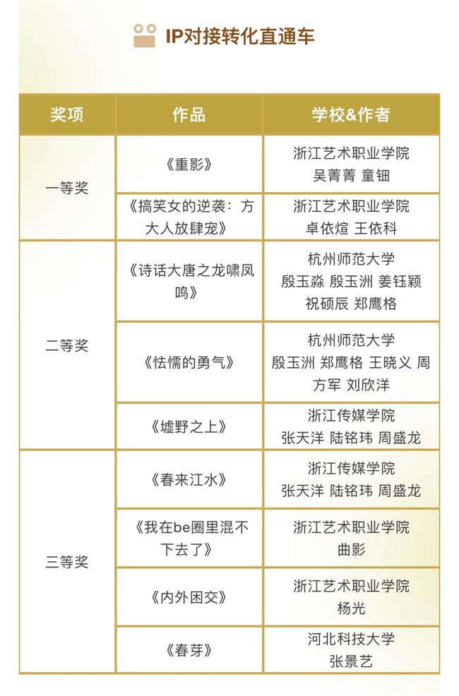 本届金鹄青年电影节共收到来自清华大学、北京电影学院等200所国内外院校的1296件参赛作品,最终有285部作品成功入围。最终,由评委会评选出5个单元的77个奖项以及10个最佳组织单位。具体获奖名单如下: