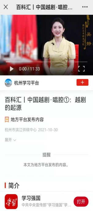 说做就做,由浙艺戏曲学院副院长周伟君领衔研发,戏曲学院戏曲表演专业教学团队的老师们群策群力开始了课程建设。周伟君介绍,《中国越剧·唱腔》课程可以满足各类人群学习越剧唱腔的需要,兼具专业性与可观性。课程先后在智慧树平台、浙江文化干部网络学院平台及“学习强国”平台上线,面向全省专业、民营文艺表演团体演职员开放,年选课量达到20000人次。她希望能有更多人通过课程喜欢越剧,爱上越剧,让更多人加入到传承越剧这一民族艺术瑰宝的事业中来,让越剧人心中的光永远亮下去。