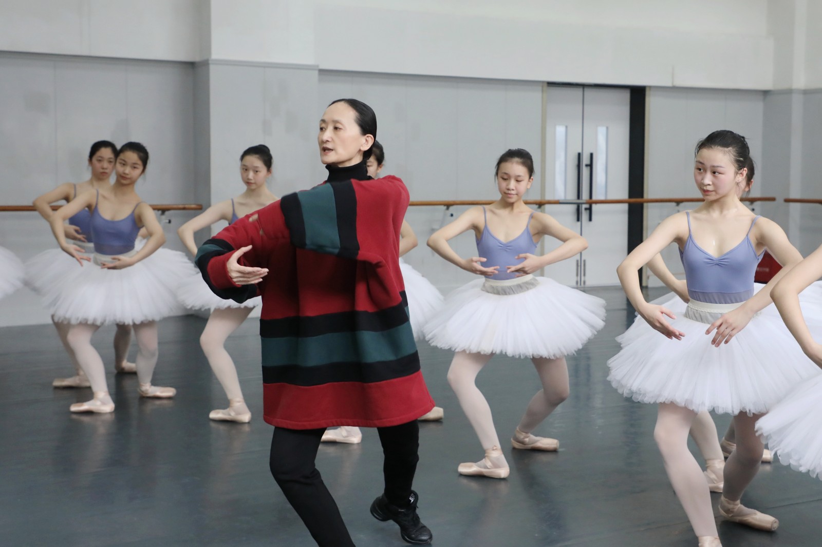 交流中,冯英现场做示范,对学生进行指导,手把手指点学生的动作,从呼吸、姿势等方面详细讲解如何把整套动作做到位,让舞蹈呈现更细腻、连贯。