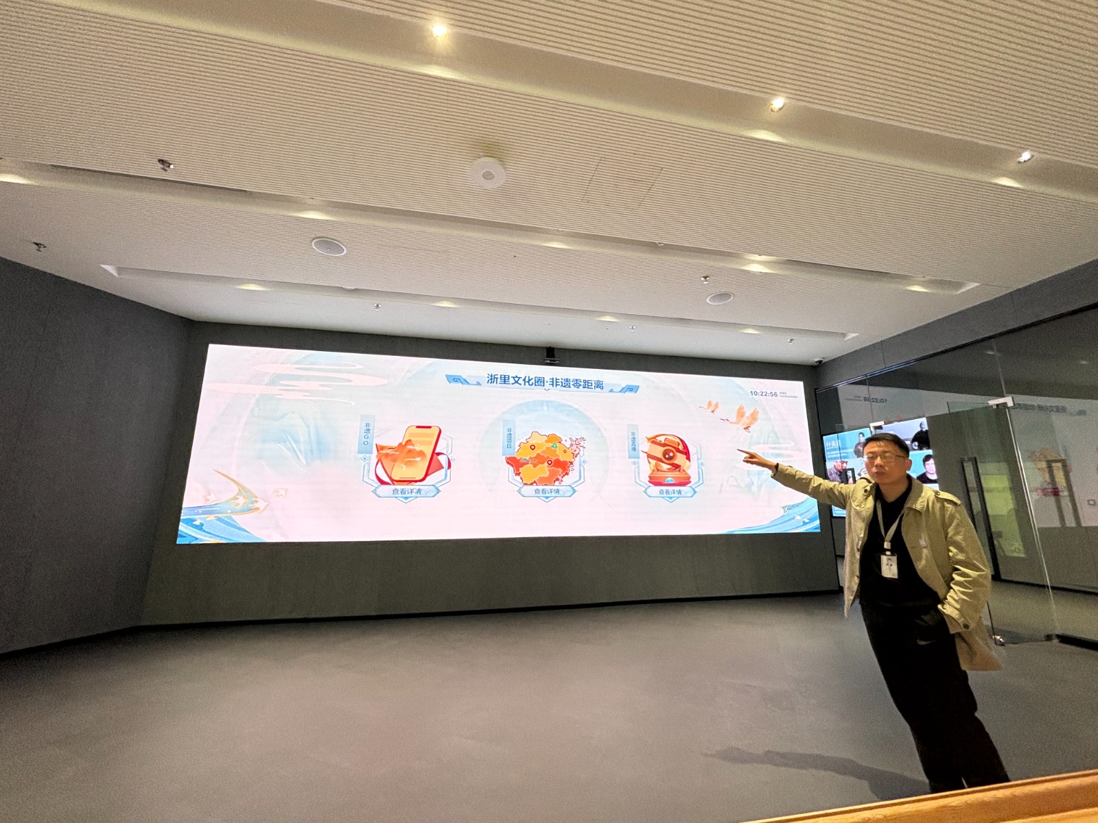 省非遗保护中心(馆)综合办公室副主任郑为贵陪同调研,详细介绍了场馆总体情况、楼层分布和浙江非遗数字大脑。