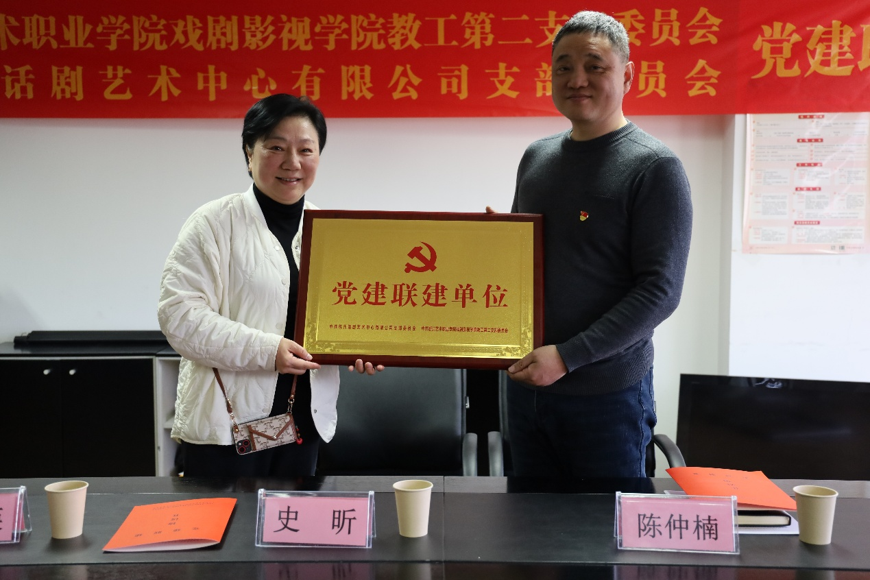 会上,双方签署了党建联建协议并举行授牌仪式,就未来合作方向及重点项目进行深入交流。同时,围绕以党建引领项目合作,史昕交流了校企合作项目话剧《北上》剧组临时党支部建立情况。